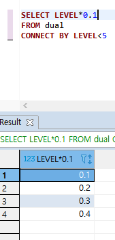 level을 조정하니 0.1씩 증가가 되었다. 이때 connect by level<5로 설정하였음에도 0.4까지 반복되는 것은