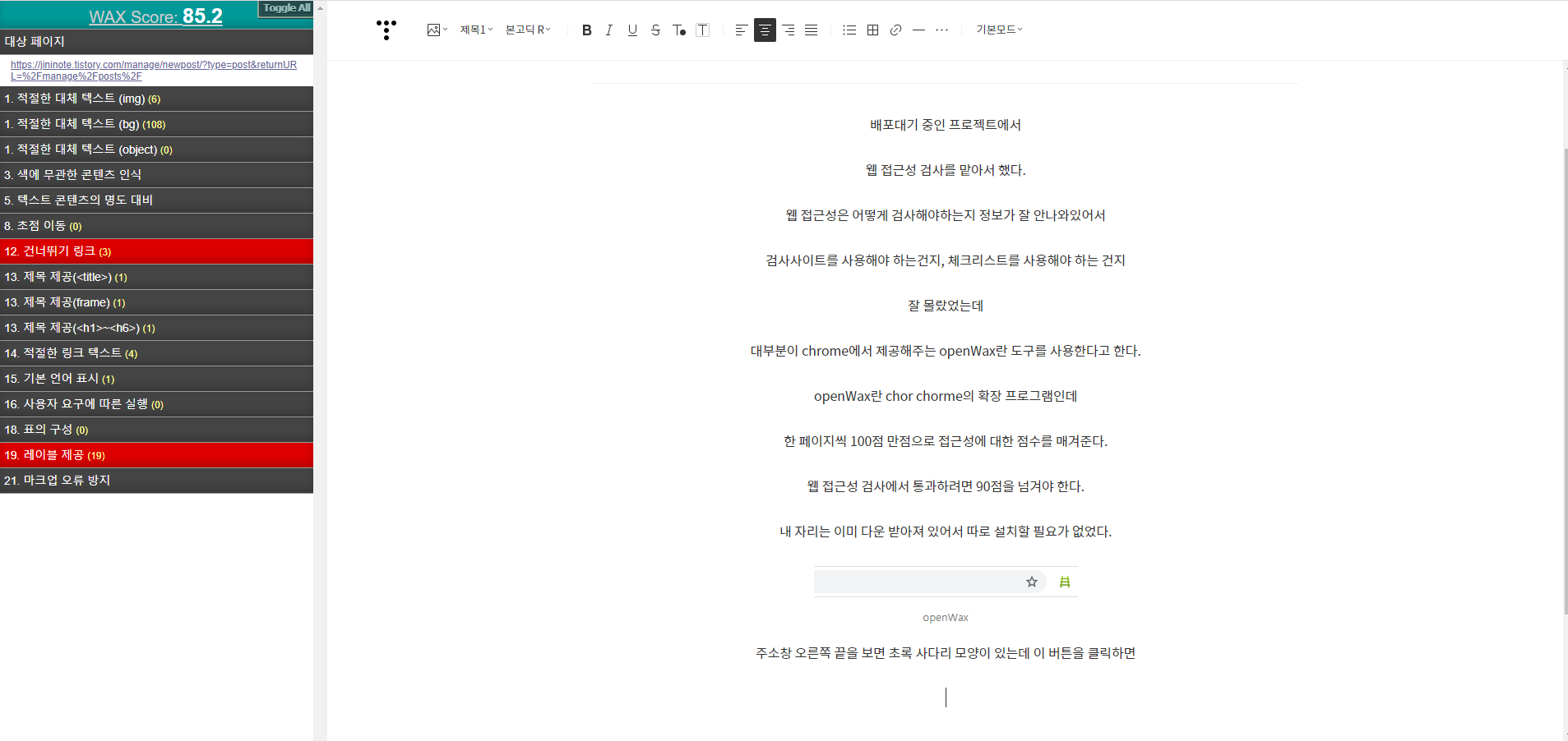왼쪽 상단을 보면 내 블로그는 85.2점으로 적절한 접근성을 갖추고있지 않다.